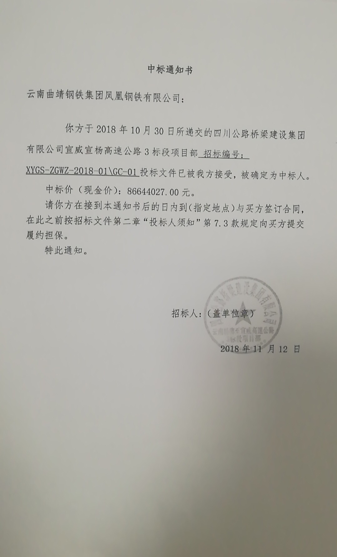 中標(biāo)四川公路橋梁集團(tuán)宣威宣揚(yáng)高速公路三段